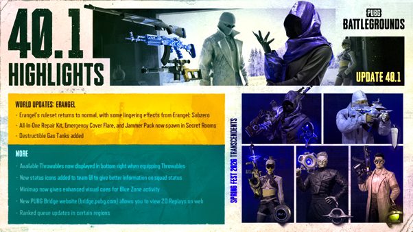 - عودة ارانغل مع تحديثات جديدة للعالم: يقدّم التحديث 40.1 إضافة خزانات وقود قابلة للتدمير في أنحاء الخريطة، إلى جانب غنائم جديدة في الغرف السرية، تشمل طقم الإصلاح الشامل، وشعلة التغطية للطوارئ، وحزمة التشويش. كما تم تحسين الإضاءة الداخلية للمباني في جميع أنحاء الخريطة لتعزيز الرؤية أثناء الاشتباكات.